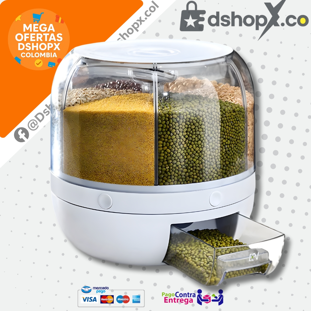 Descubre el dispensador de granos 6 en 1 perfecto para mantener tu cocina organizada y tus alimentos siempre frescos. Este práctico y moderno dispensador te permite almacenar hasta seis tipos diferentes de granos o legumbres en un solo contenedor compacto, ideal para arroz, lentejas, frijoles, avena, quinoa y más.